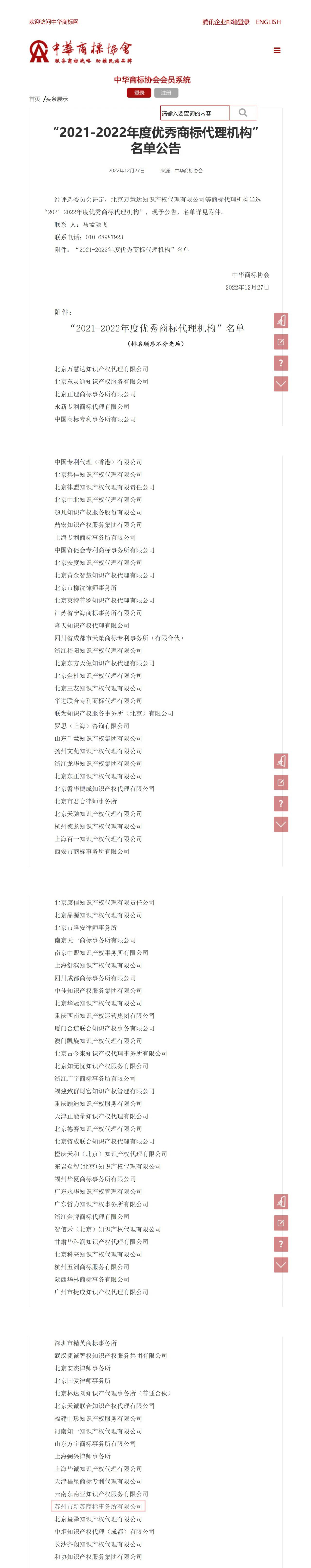 近日,中華商標(biāo)協(xié)會(huì)發(fā)布了“2021-2022年度優(yōu)異商標(biāo)代理機(jī)構(gòu)”名單公告。經(jīng)評(píng)選委員會(huì)評(píng)定,蘇州市新蘇商標(biāo)事務(wù)所有限公司等87家商標(biāo)代理機(jī)構(gòu)當(dāng)選“2021-2022年度優(yōu)異商標(biāo)代理機(jī)構(gòu)”。不僅如此,同時(shí)我所優(yōu)異代理人高翔,成功入選中華商標(biāo)協(xié)會(huì)第三批“商標(biāo)代理優(yōu)異服務(wù)個(gè)人”名單